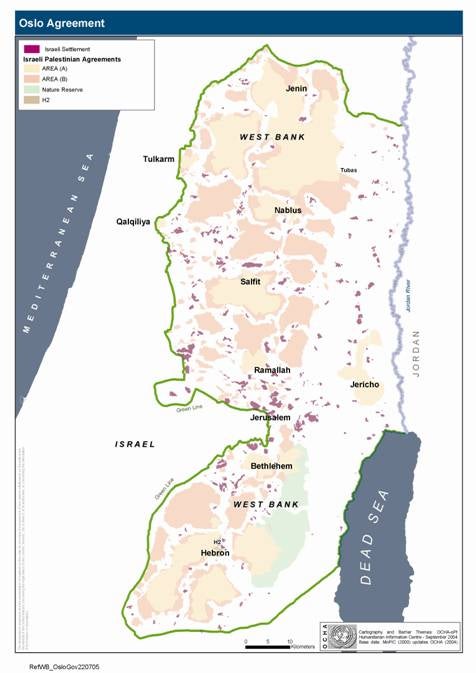 المناطق الجغرافية في الضفة الغربية بموجب اتفاقية أوسلو © 2005 مكتب تنسيق الشؤون الاجتماعية الأراضي الفلسطينية المحتلة