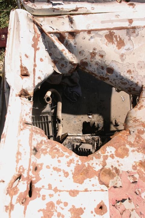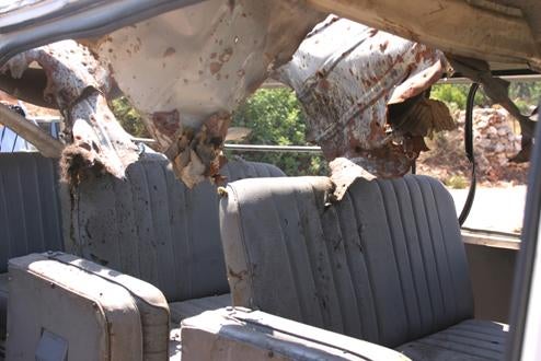 Human Rights Watch examined the struck ambulances, which were stored at the Red Cross parking lot in Tyre, and found that the damage to the vehicles also supports the accounts of the eyewitnesses. Both ambulances clearly show missile entry points on the roof, with ambulance 782 struck directly through the Red Cross emblem and ambulance 777 towards the rear of its roof, and smaller missile exit points on the floor of the ambulances. Human Rights Watch found the rooftop air vent of ambulance 782, which showed that it had itself been penetrated by a missile; the circular vent was about 30 cm in diameter, and was located at the center of a much larger red cross that covered the entire roof of the ambulance. Human Rights Watch located the gurney on which Ahmad was lying when the missile struck and severed his leg, which clearly shows the impact of a missile.
