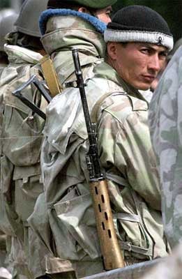 Uzbek soldiers block the way to the bridge over the border river to Kyrgyz territory in eastern border Uzbek town of Qorasuv, May 21, 2005. © 2005 Reuters