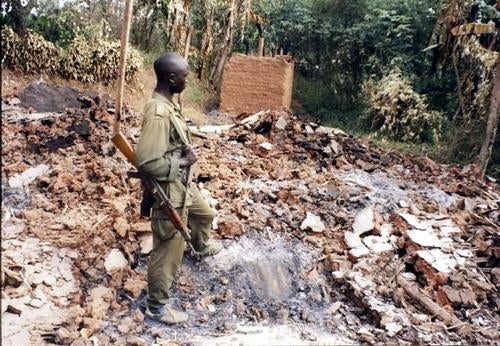 A Ugandan soldier looks at the remains of a Congolese village, where people were burnt alive in their houses, April 2003. © Anonymous