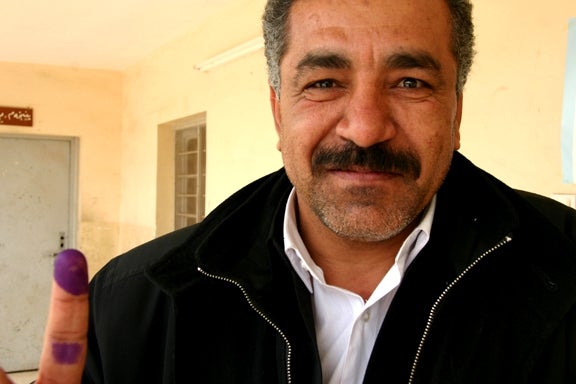 A Kurdish man in Arbil shows the dye on his finger after voting.