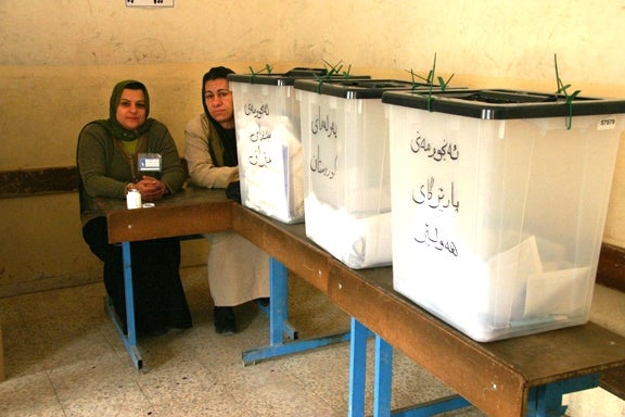 Elections workers at a polling place in Arbil. The boxes hold ballots for three elections: the Transitional National Assembly, the Iraqi Kurdistan National Assembly and the Arbil Governorate.
