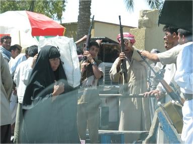 Iraqis inspect weapons at a market in Fallujah, Iraq on May 5, 2003. U.S. military commanders said they were unaware of the market until they were informed of it by Human Rights Watch researchers.© 2003 Peter Bouckaert/Human Rights Watch.