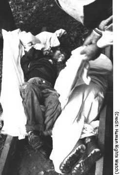 The bodies of Gentiona and Donietta Deliaj, seven and five-years old, being removed from the site of the massacre in the forest near Donje Obrinje, Kosovo. Eighteen members of the Deliaj family were killed in the attack.