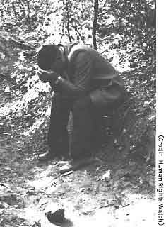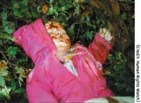 at the Donje Obrinje massacre site in Kosovo. She is partially covered by the body of her