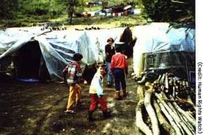 Villagers from Kisna Reka, Kosovo constructed these shelters with plastic sheeting after fleeing Yugoslav forces.