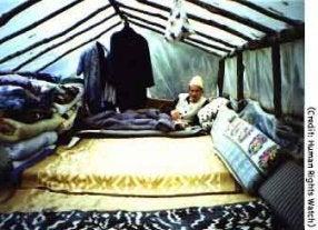 An ailing elderly man from Kisna Reka, Kosovo, rests in his family's tent after fleeing from Yugoslav forces.