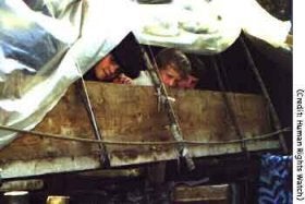 Children peek out from the plastic cover of their shelter outside of Kisna Reka, Kosovo. Hundreds of villagers fled to the forest to escape attacks from Yugoslav forces.