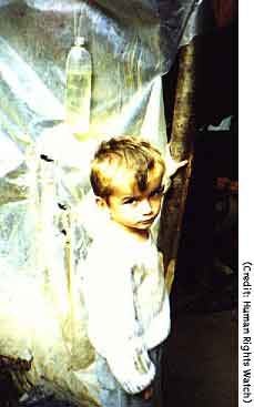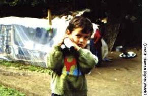 A young boy at the entrance to his family's plastic tent near Kisna Reka, Kosovo. Dozens of villagers from the area fled to the forest to escape attacks from Yugoslav forces.