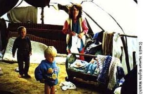 A family with a newborn copes in a makeshift shelter outside of Kisna Reka, Kosovo. Dozens of villagers from the area fled to the forest to escape attacks from Yugoslav forces.