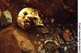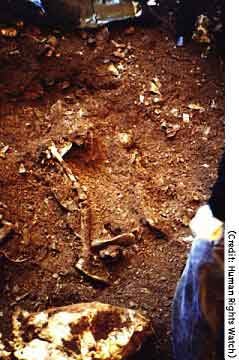 A skull with an apparent bullet wound in Klina, Kosovo, where Yugoslav authorities exhumed the remains of four people they claimed were victims of the Kosovo Liberation Army (KLA). 138 individuals are believed to have been detained by the KLA.