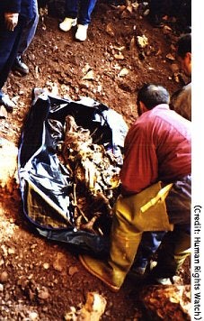 A heavily decomposed body of a person allegedly killed by the Kosovo Liberation Army is exhumed by Yugoslav authorities in Klina, Kosovo.