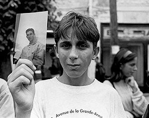 ![]() ©Human Rights Watch 1999 Albanian boy showing a picture of a relative held prisoner by Serb security forces. He and other Prizren residents took part in a public protest in late June to draw attention to the fate of hundreds of missing detainees who are presumed to have been taken to Serbia. (Further information on the missing detainees is available in Kosovo Human Rights Flash #49.) |