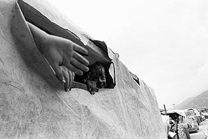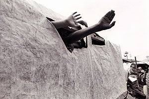 Tractors full of returning Kosovar Albanian refugees at the Morine border crossing in late June.
