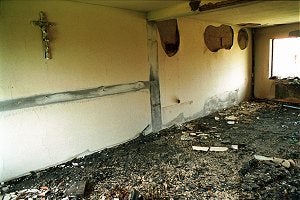 ![]() ©Human Rights Watch 1999 Interior of a home in Koronica, a village inhabited by Albanian Catholics. Five men were executed by Serb security forces on the third floor of this house on April 27. After killing the men, the Serb forces burned the victims' corpses and set the house on fire. (See Kosovo Human Rights Flash #48.) |