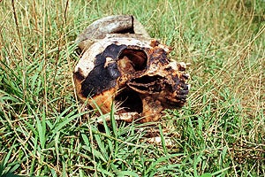A skull in front of a house in Krushe e Vogel (Mala Kruse), a village devastated by Serb paramilitaries in late March. (See Kosovo Human Rights Flash #14.)