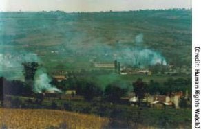 Burning villages in the Drenica region, Kosovo, as viewed from the village of Plocica, September 27, 1998. Many of the homes in the foreground had already burned. Heavy artillery could be heard in the background as the bombardment by Yugoslav forces of abandoned villages continued.