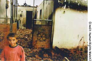 A child in front of his destroyed home in Plocica, Kosovo. Yugoslav forces are alleged to have destroyed thousands of homes, forcing approximately 250,000 people to flee throughout Kosovo.