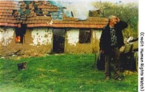 A villager from Plocica despairs in front of his burning food storage shed. Human Rights Watch found widespread evidence that food storage units, granaries, cattle and other objects essential to the survival of the civilian population were systematically targeted for looting and destruction by Yugoslav forces.