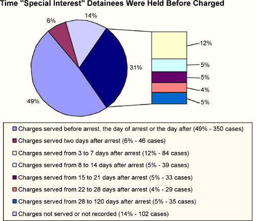 Source: INS detainees defined as "special interest" cases on a list released by the Department of Justice on January 11, 2002, the only detailed list of detainees that the U.S. government has disclosed to date. For an analysis of these data see section on Widespread Delays in Filing Charges contained in the report "Presumption of Guilt: Human Rights Abuses of Post-September 11 Detainees." |