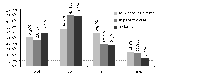 Parmi les enfants interrogés, ceux accusés de viol avaient 6,5 fois plus de chances de voir un avocat que ceux accusés de vol. Ceux accusés de viol avaient également 16,1 fois plus de chances de voir un avocat que ceux accusés de participation aux bandes armées. Ceci est probablement dû au fait que les programmes des ONG telles que Victimes de Torture fournissent une assistance juridique dans certaines affaires de viol. Parmi les enfants accusés de participation aux bandes armées, seul un sur 32 avait vu un avocat. Trop peu dobservations étaient disponibles dans la catégorie « autres » pour établir une comparaison valable. Tableau 7 Motifs darrestation et situation parentale