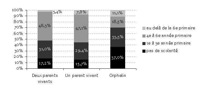 Les données semblent indiquer que les orphelins sont en moyenne moins instruits que les enfants ayant un ou deux parents en vie. Plus de 70 pour cent des orphelins navaient terminé que leur troisième année primaire ou nétaient même pas arrivés à ce niveau, alors que moins de 50 pour cent des enfants ayant un ou deux parents en vie se trouvaient dans ce cas. 192 Aux fins de cette recherche, le « travail domestique » est défini comme étant le travail que lenfant effectue hors de chez lui pour une autre famille et en échange duquel il reçoit un salaire mensuel. 193 Cette catégorie comprend, entre autres occupations, les pêcheurs, les maçons, les cordonniers, les mécaniciens et les soudeurs. |