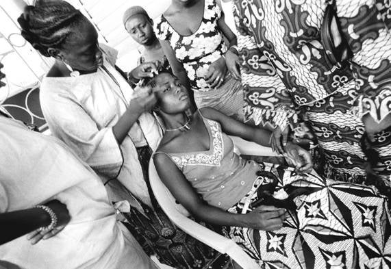 Une ancienne travailleuse domestique se fait tresser les cheveux par dautres anciennes travailleuses domestiques, qui apprennent la coiffure dans un centre de formation géré par une ONG guinéenne, AGUIAS (Association Guinéenne des Assistantes Sociales). © 2007 Susan Meiselas/Magnun Photos