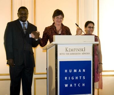 Arnold Tsunga und Mandira Sharma, die für Ihr außenordentliches Engagement zum Schutz der Menschenrechte von Human Rights Watch geehrt wurden, mit Jane Olson, Chair des Human Rights Watch Board of Directors zurück