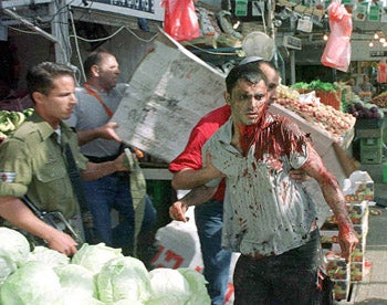 An Israeli civilian injured in the May 19, 2002 attack on the Netanya market receives help. (c) Reuters Ltd. MORE ON: Israel, the Occupied West Bank and Gaza Strip, and Palestinian Authority Territories |