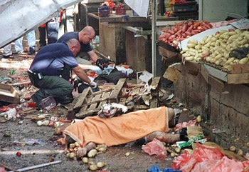 On May 19, 2002, a suicide bomber dressed as an IDF soldier attacked an open air market in Netanya. Israeli policemen search the scene beside a covered body. Three people were killed and more than thirty wounded in the attack, for which both Hamas and the PFLP issued claims of responsibility. MORE ON: Israel, the Occupied West Bank and Gaza Strip, and Palestinian Authority Territories |