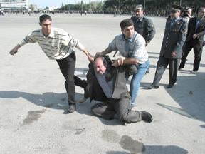 Two men with police assistance beat and drag away a man on Azadliq Square. © 2003 Peter Bouckaert/Human Rights Watch