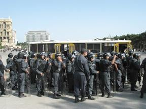 Riot police arrive at Azadliq Square prior to their attack on the protesters. © 2003 Peter Bouckaert/Human Rights Watch