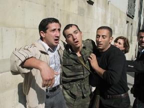 Men helping a soldier beaten by protesters escape further violence.© 2003 Peter Bouckaert/Human Rights Watch