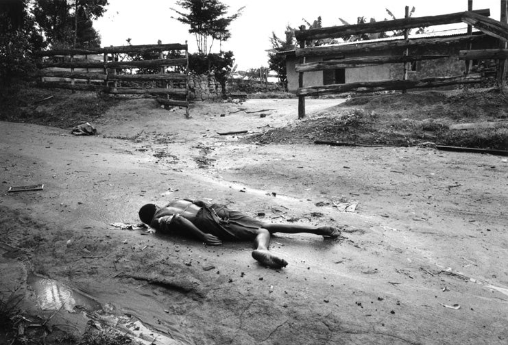 Bodies of Hema men, executed by Lendu militia, lie on the road north of Fataki. They were bound and impaled before being shot.