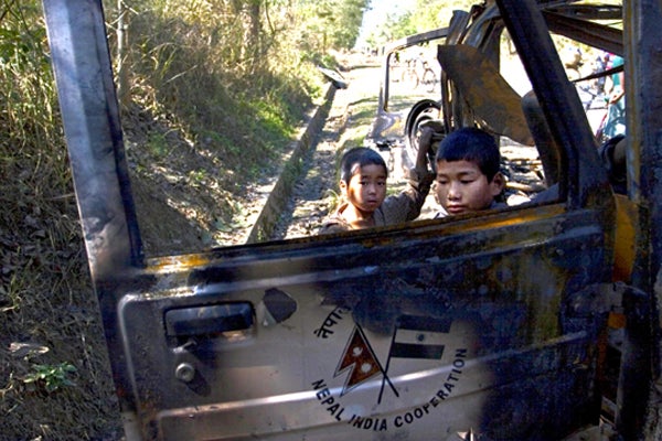 The remains of a burned ambulance destroyed by Maoist insurgents at a blockade they set up on the Mahendra highway, in the town of Nepalgunj, February 22, 2005. Under the laws of war, medical transport is protected at all times from attack.