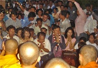 Enlarge This Image Activists released: Kem Sokha, Pa Nguon Teang, Mom Sonando and Rong Chhum (L-R) upon their release from prison on January 17, 2005.