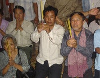 Enlarge This Image Left to right in front: Rong Chhun, Mom Sonando’s wife, Sonando, Kem Sokha and Sokha's wife pray at the pagoda near Prey Sar prison shortly after their release.