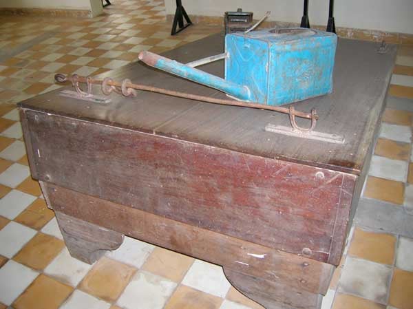 Photographs of a restraint board reportedly for waterboarding used by the Khmer Rouge in Cambodia in the 1970s, currently in the Tuol Sleng museum of Khmer Rouge crimes in Phnom Penh.