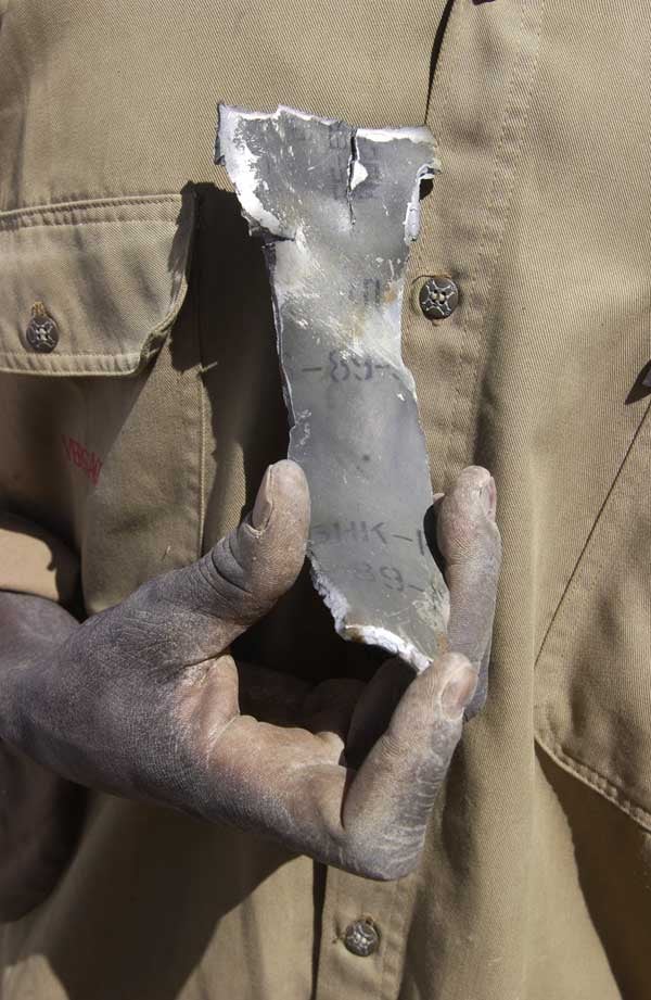 A villager holds shrapnel from weapons fired during the attack on Goungor.