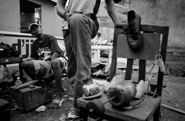 Street children's survival depends on their ability to find work. Children shine shoes for small change.