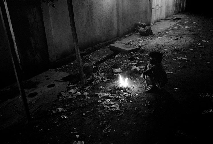 A street girl warms herself by a fire in the evening.