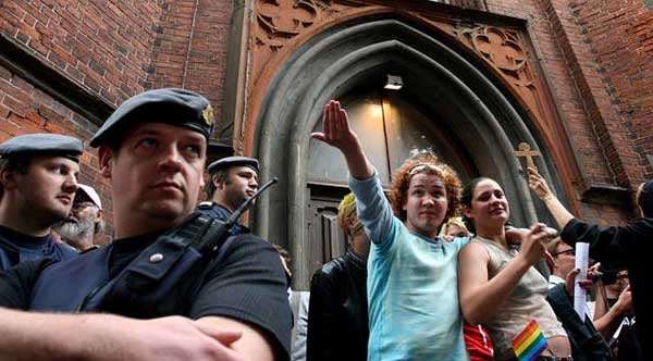 8.Policemen watch participants at an ecumenical service at an Anglican Church during the first Gay Pride in Riga, Latvia, while anti-gay demonstrators threaten them, July 23 © 2005 Reuters Limited.