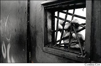 A guard's hand rests on the grate of a heavy metal door leading to one of the five compounds of the Tatuape Women's Prison, in São Paulo, Brazil. The prison originally housed a juvenile detention center but was closed because of poor conditions. It was later reopened as a women's prison without any additional renovations.