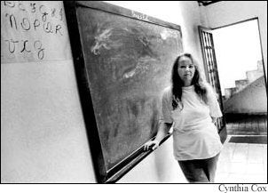 Kit C., an inmate at Tatuape Prison, stands in the classroom where she offers English classes to both inmates and guards. She got some of the books for her courses from her embassy, but has received no assistance or materials from the prison.