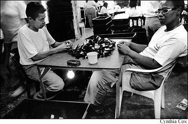 Two inmates work through the day testing plugs as part of an inmate work program done in coordination with private companies. The woman on the right, a foreign prisoner, sits in silence with a Brazilian woman.