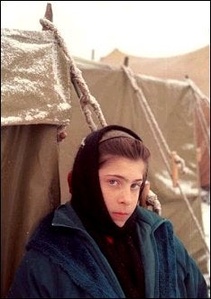 Una niña refugiada ésta en frente de su carpa durante una tormenta de nieve en Sputnik, el 24 de diciembre de 1999. A mitad de diciembre, ella dice que las autoridades rusas le negaron comida a su familia por tres dias, esperando que así regresaran a las areas de control ruso en Chechenia. La familia reportó que su casa en Sernovodsk fue completamente saqueada por soldados rusos en noviembre. No hay ningún colegio para la niña en el campamento de refugiados.