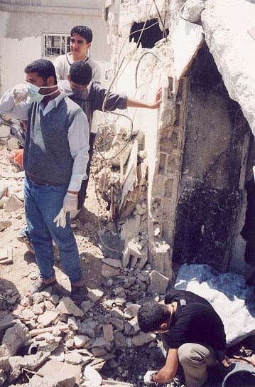 Trabajadores de rescate palestinos hacen una búsqueada para restos humanos en el escombro del districto de Hawashin. No había machinaria para trabajos pesados disponible durante los primeros días después de que el combate había terminado, y los salvavidas tuvieron que cavar por el escombro con sus manos. (c) 2002 Peter Bouckaert/Human Rights Watch