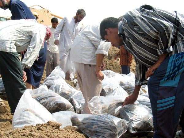Familiares intentan identificar los restos de los cuerpos desenterrados de una fosa común cerca de Hila. © 2003 Peter Bouckaert/Human Rights REGRESAR