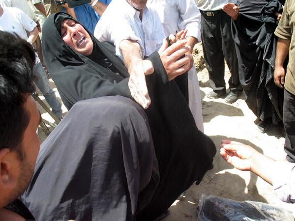 Una mujer se aflige luego de identificar los restos de un familiar desaparecido, hallados en una fosa común cerca de Hila.