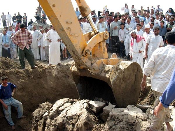 Una excavadora desentierra una fosa común cerca de Hila, que contiene